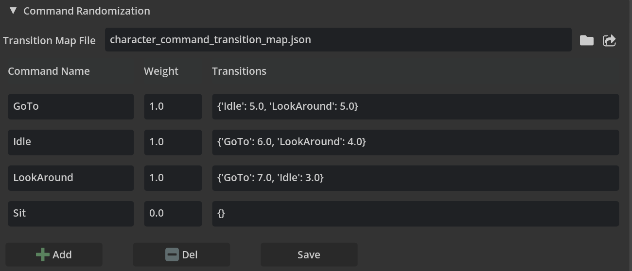 . You can further define the randomization rules for “Generate Random Commands” using character_command_transition_map.json
