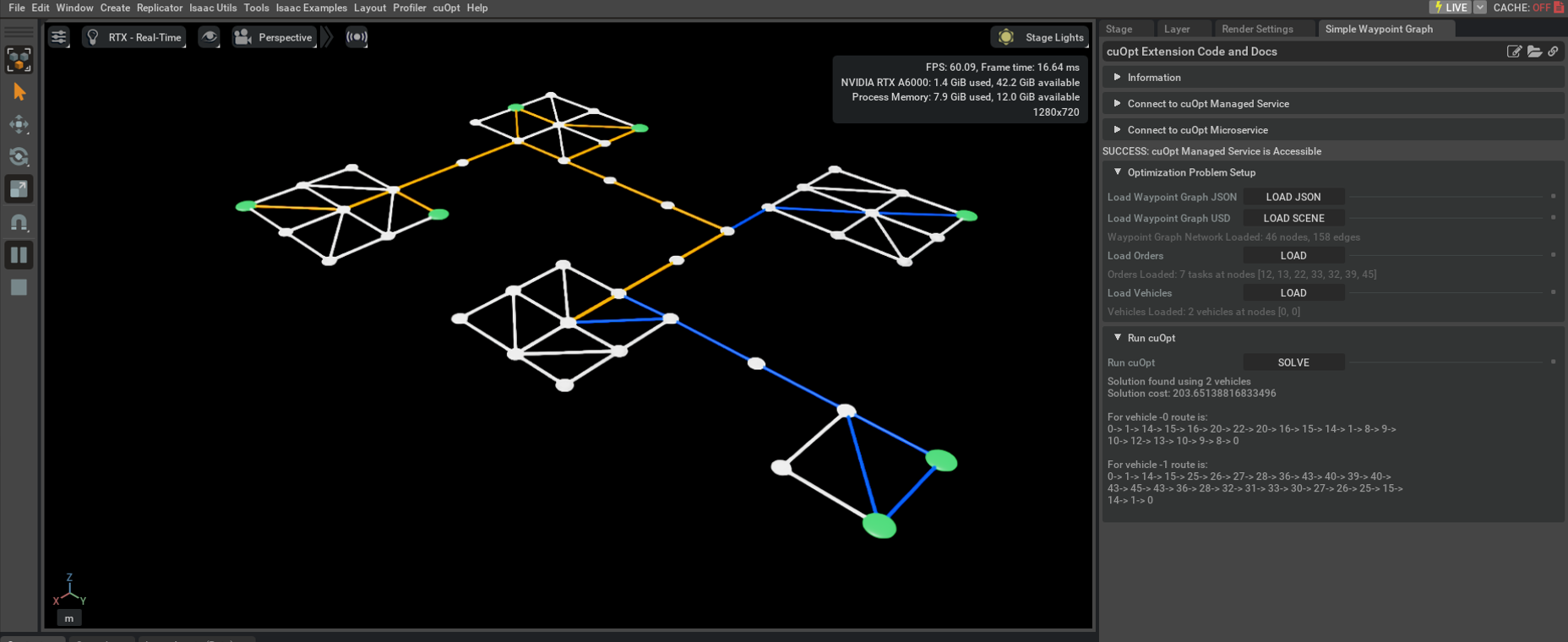 Demonstrate and provide a reference for the use of NVIDIA cuOpt to solve routing optimization problems in simulation.