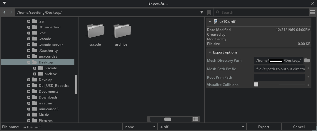 .In the Mesh Directory Path field, select the correct folder path to save the URDF meshes.