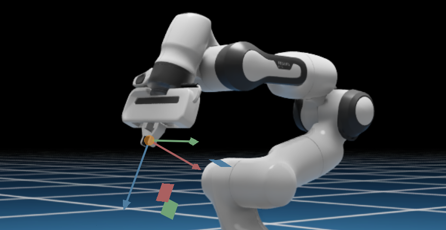 This is convenient when the axes have semantic meaning, such as for the end-effector. The Franka’s end-effector frame is as shown in the following figure with the x-, y-, and z-axes depicted in red, green, and blue, respectively.