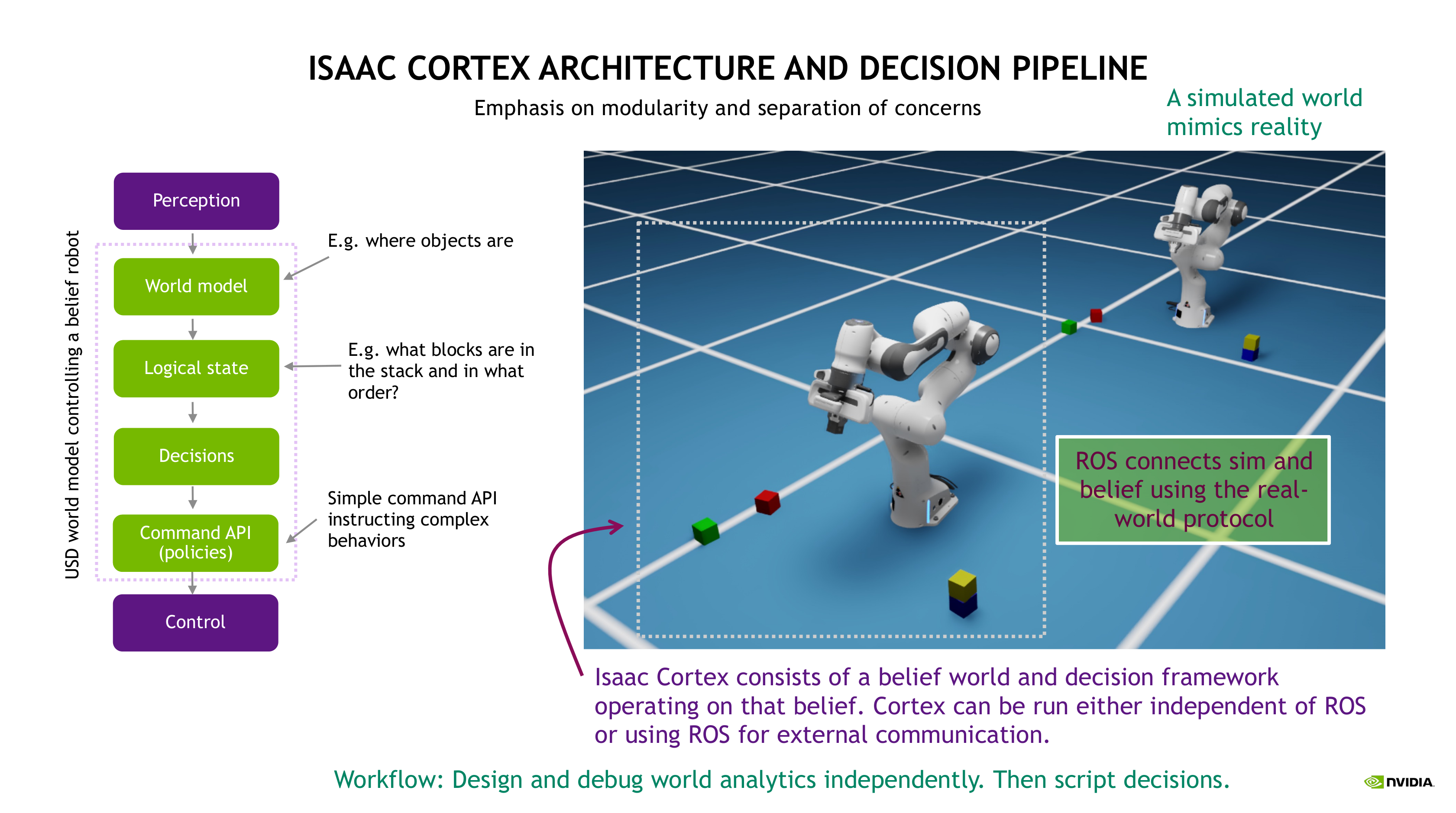 The Cortex pipeline (detailed in the next section) revolves around leveraging the simulator as the world model. Isaac Sim has an expressive world representation based on USD with PhysX built on it, so this world model is both a detailed database of state information and physically realistic.