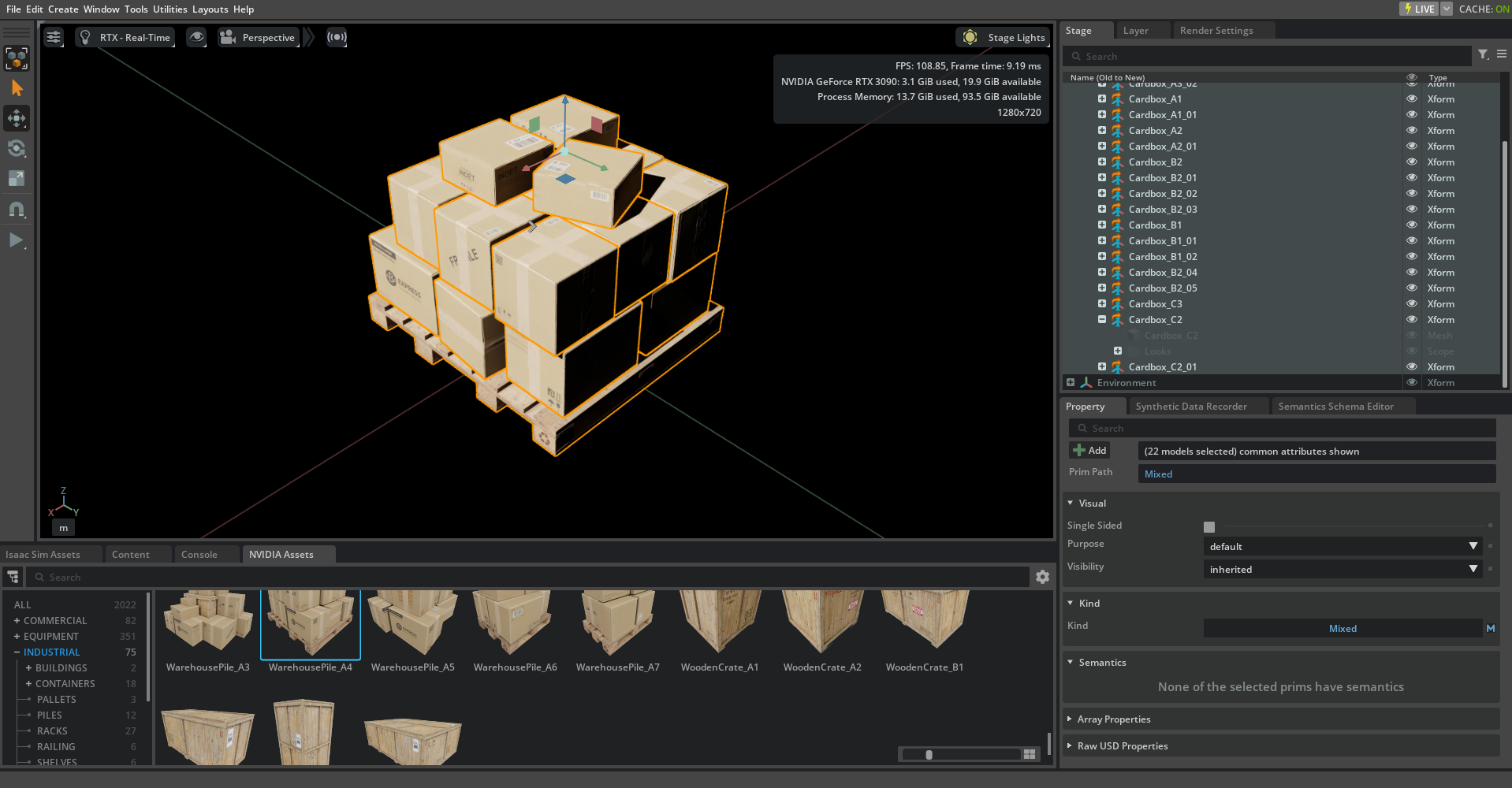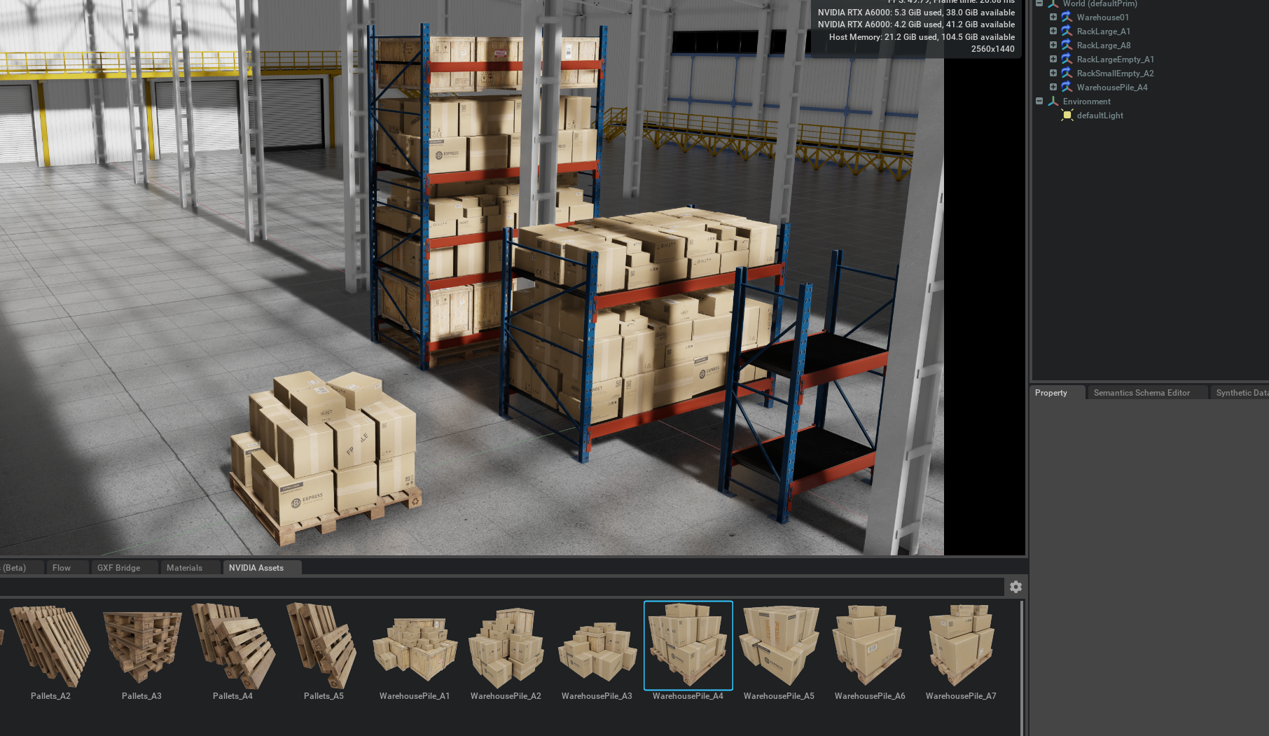 Omniverse also contains a suite of SimReady Assets, which are assets curated for machine learning and digital twins. These assets come fully annotated for Semantic Labeling, and also contains a preset physics setup so you can get started with your digital twin operation. For more details, visit the NVIDIA On Demand session: SimReady Specification
