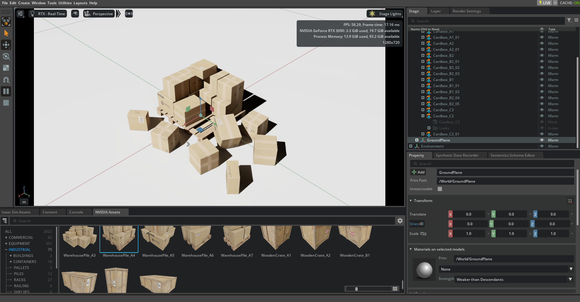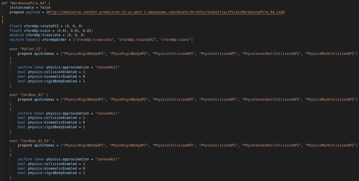 Let’s make a variation of WarehousePile_A04 that contains physics properties, with boxes being individual rigid bodies.