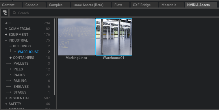 Any asset in NVIDIA Assets can be used to compose your scene, browse around the categories to find the asset you need, or search by name.