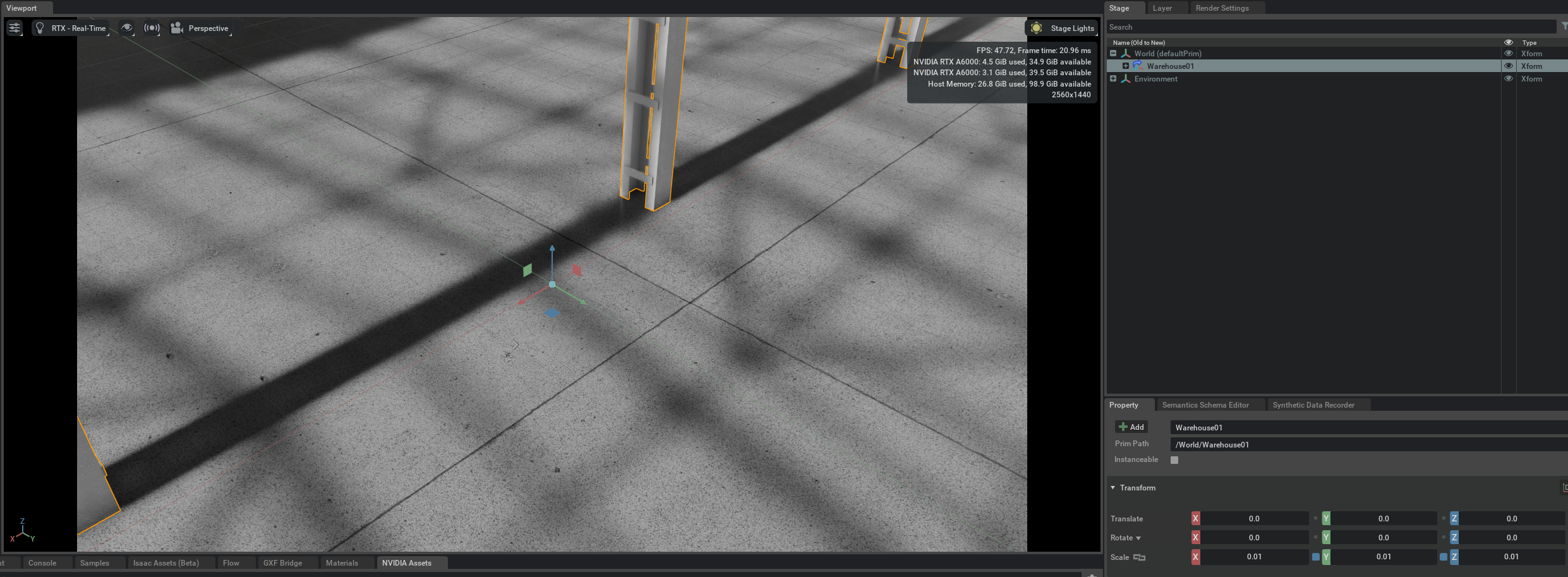 Depending on which assets you goals, you may find NVIDIA Assets that are currently on a centimeter scale. This is because NVIDIA Assets are created by our art team, while Isaac Sim Assets have been curated with intent. Be mindful of the units! When importing certain assets, you may need to manually scale them down to units of 0.01. To do this, select the asset prim, click on “Add Transform” on the Properties pane, and set the scale to 0.01 on all directions.