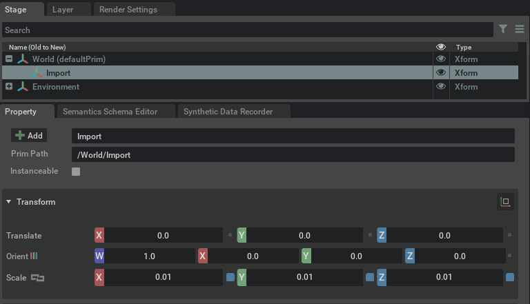 We start with a brand new Stage, and create an Xform under World with the name “Import”, and set its scale to 0.01