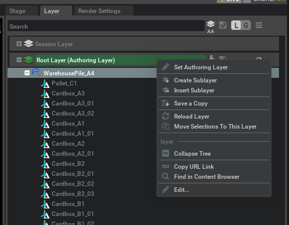 You can now go back to the previously saved asset to customize it to contain physics material properties, different mass properties, and so on. All changes will be stored locally and be applied on top of the original asset. To see the local changes, you can go to the Layer tab, right click the Root layer, and click on Edit.