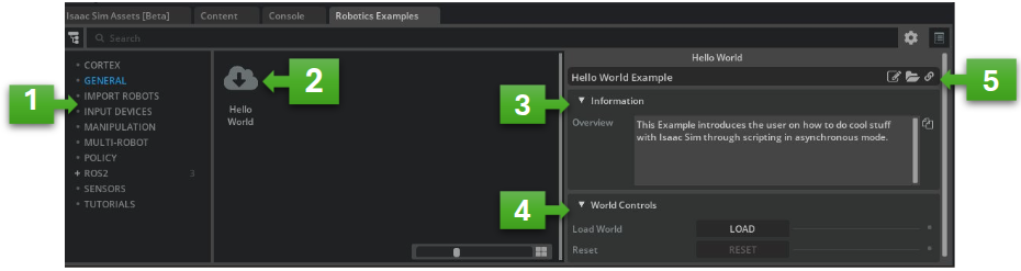 Interactive examples can be found by going to the top Menu Bar and clicking Window > Examples > Robotics Examples. A browser should appear on the bottom left of the screen, in the same space as the Content browser. Click on the Robotics Examples tab to bring the browser into view.