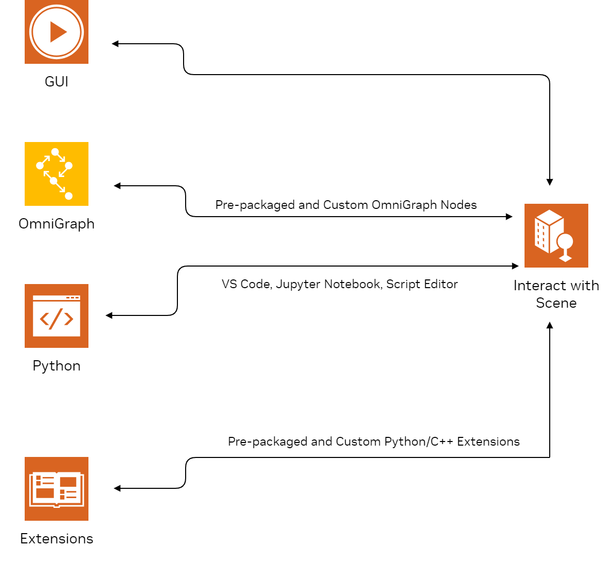 Once the assets have been imported and the scene has been set up, there are various ways to interact with the simulated environment, which are summarized below.