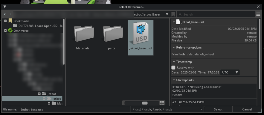 Isaac Sim/Samples/Rigging/Jetbot/Jetbot_Base/Jetbot_base.usdin the dialog.For