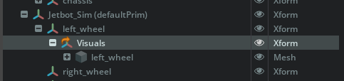 /Visuals/left_wheelprim. The mesh forleft_wheelshows as a child. Verify that a Looks scope was created inJetbot_Sim, with the materials for this mesh.Verify that the wheel is referenced correctly in place, along with the base mesh that is at the origin. You can hide the Visuals scope so base meshes won’t be visible.