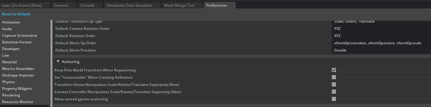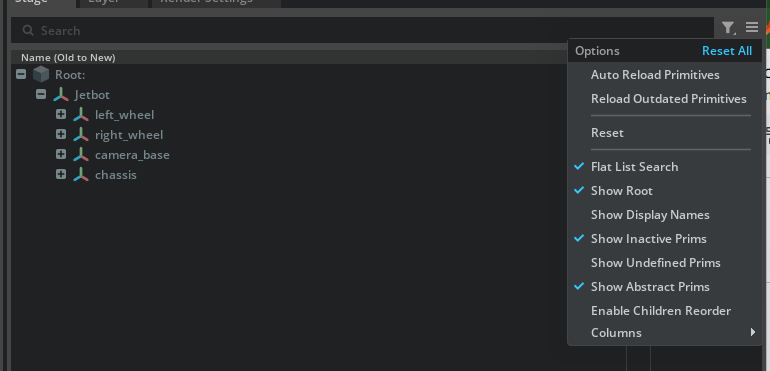 The Jetbot asset is already close to the final goal, but to work on a retargeting of the structure to get the merged meshes, create a new prim to be set as default.