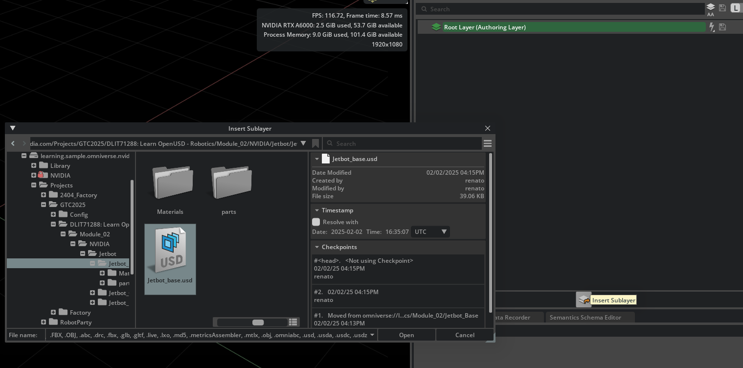 Isaac Sim/Samples/Rigging/Jetbot/Jetbot_Optimized/Jetbot_optimized.usd, verify that you have an empty USD.Select the Layers panel, click the Insert Sublayer button at the bottom of the tab, select