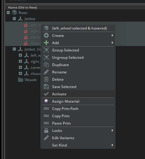 Visuals/right_wheel. Verify that the Jetbot wheel disappears.Select