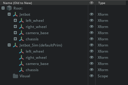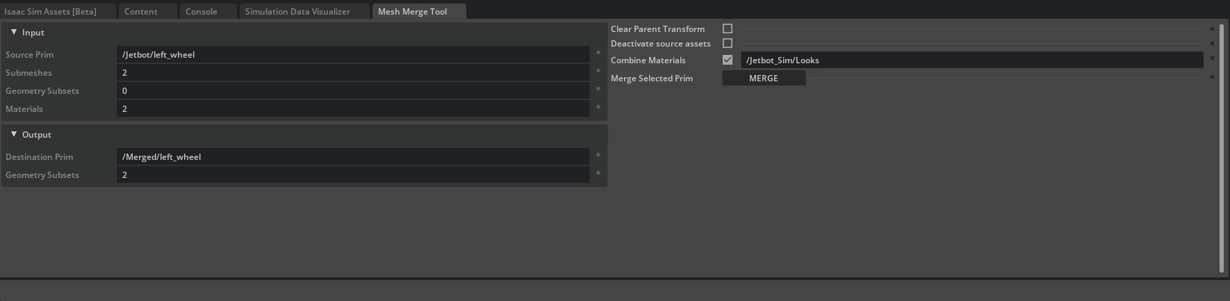 Isaac Sim/Samples/Rigging/Jetbot/Jetbot_Optimized/Jetbot_optimized_post_merge.usd, if you have not merged all the meshes.The left and right wheel meshes are identical. Further simplify the asset by having left and right wheel reference the same mesh. Select