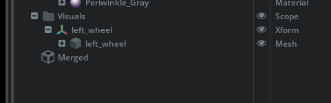 left_wheeland drag the resulting mesh into it. Remove the/Mergedxform from the stage.To create an internal reference to the wheel, create a Visuals Xform inside