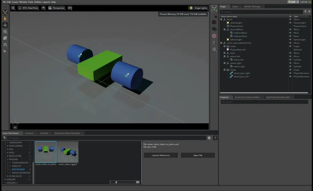 mock_robot.usdsaved, open it using File > Open. Otherwise, load the asset provided in the Content Browser atIsaac Sim/Samples/Rigging/MockRobot/mock_robot_no_joints. Do not load it as a reference because you must make permanent modifications to the file.For organization, create a Scope to store the joints by right clicking Create > Scope, rename it to Joints.