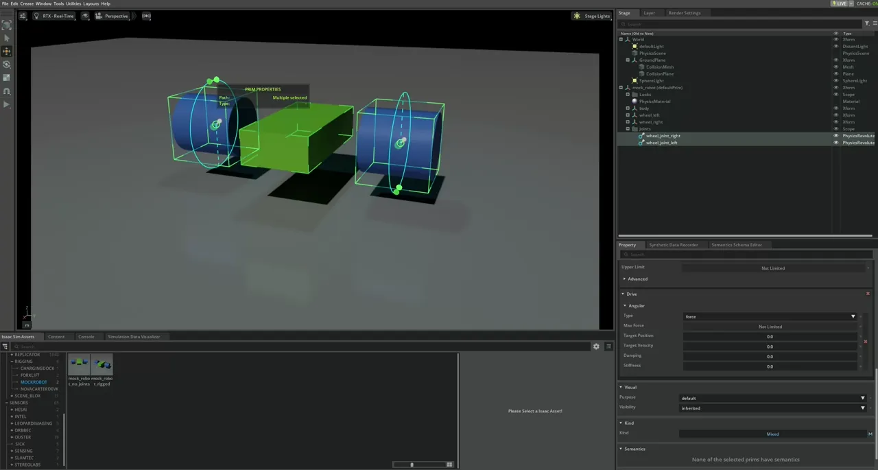 For joints on a wheel, it makes more sense to be velocity controlled, so set both wheels’ Damping to 1e4 and Target Velocity to 200 rad/s. If you are working with joints with limited range, those can be set in the Property tab, under the Raw USD Properties > Lower (Upper) Limit. Press Play to see the mock mobile robot drive off.