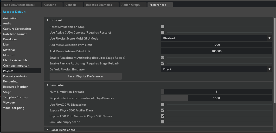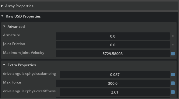 Scroll down to Raw USD Properties under the Advanced tab, set the Armature, Joint Friction attribute to the value specified in the environment definition file.