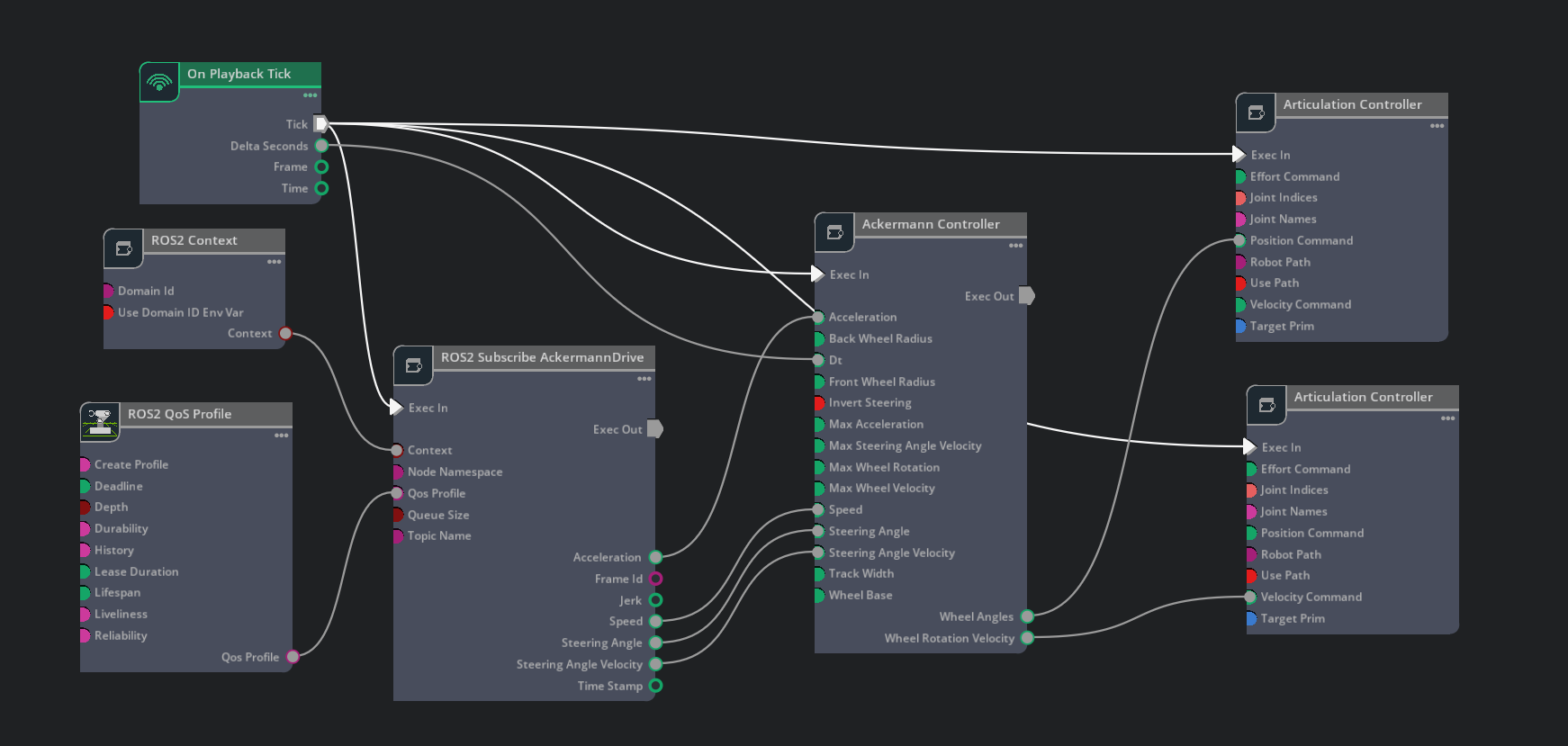 Creating and setting up an Ackermann Controller node and with articulation controller nodes.