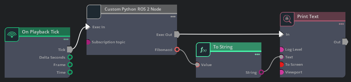 OgnCustomPythonRos2NodePy.ognlocated in thecustom.python.ros2_node/custom/python/ros2_node/ogn/python/nodesfolder) with the following specification.This specification defines an OmniGraph node with two inputs (the input execution trigger, and the topic name to subscribe to (a string)) and two outputs (the output execution trigger, and the computed Fibonacci number (an integer)).