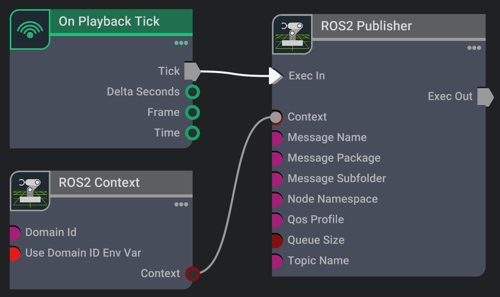 Add (and connect) the following OmniGraph nodes into the Action Graph: