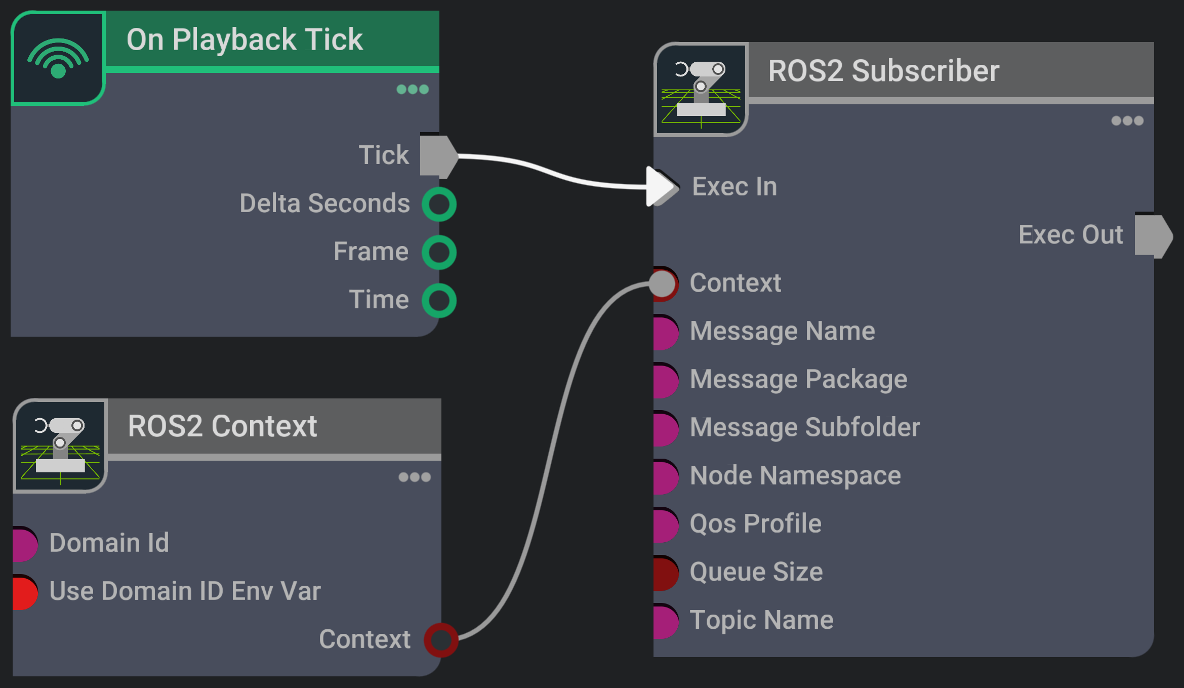 The following example shows how to create a subscription to the topic /object_pose, with the ROS 2 message type geometry_msgs/msgs/Pose, to teleport an object to the received pose using the generic ROS2 Subscriber node.