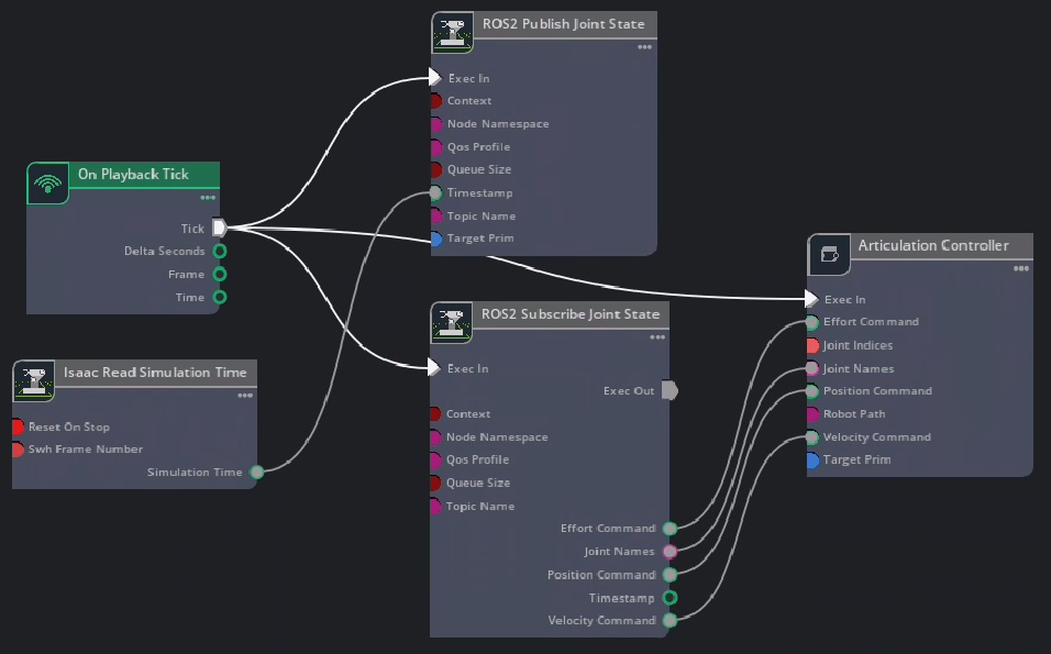 import omni.graph.core as og og.Controller.edit( {"graph_path": "/ActionGraph", "evaluator_name": "execution"}, { og.Controller.Keys.CREATE_NODES: [ ("OnPlaybackTick", "omni.graph.action.OnPlaybackTick"), ("PublishJointState", "isaacsim.ros2.bridge.ROS2PublishJointState"), ("SubscribeJointState", "isaacsim.ros2.bridge.ROS2SubscribeJointState"), ("ArticulationController", "isaacsim.core.nodes.IsaacArticulationController"), ("ReadSimTime", "isaacsim.core.nodes.IsaacReadSimulationTime"), ], og.Controller.Keys.CONNECT: [ ("OnPlaybackTick.outputs:tick", "PublishJointState.inputs:execIn"), ("OnPlaybackTick.outputs:tick", "SubscribeJointState.inputs:execIn"), ("OnPlaybackTick.outputs:tick", "ArticulationController.inputs:execIn"), ("ReadSimTime.outputs:simulationTime", "PublishJointState.inputs:timeStamp"), ("SubscribeJointState.outputs:jointNames", "ArticulationController.inputs:jointNames"), ("SubscribeJointState.outputs:positionCommand", "ArticulationController.inputs:positionCommand"), ("SubscribeJointState.outputs:velocityCommand", "ArticulationController.inputs:velocityCommand"), ("SubscribeJointState.outputs:effortCommand", "ArticulationController.inputs:effortCommand"), ], og.Controller.Keys.SET_VALUES: [ # Providing path to /panda robot to Articulation Controller node # Providing the robot path is equivalent to setting the targetPrim in Articulation Controller node # ("ArticulationController.inputs:usePath", True), # if you are using an older version of Isaac Sim, you can uncomment this line ("ArticulationController.inputs:robotPath", "/panda"), ("PublishJointState.inputs:targetPrim", "/panda"), ], }, )
