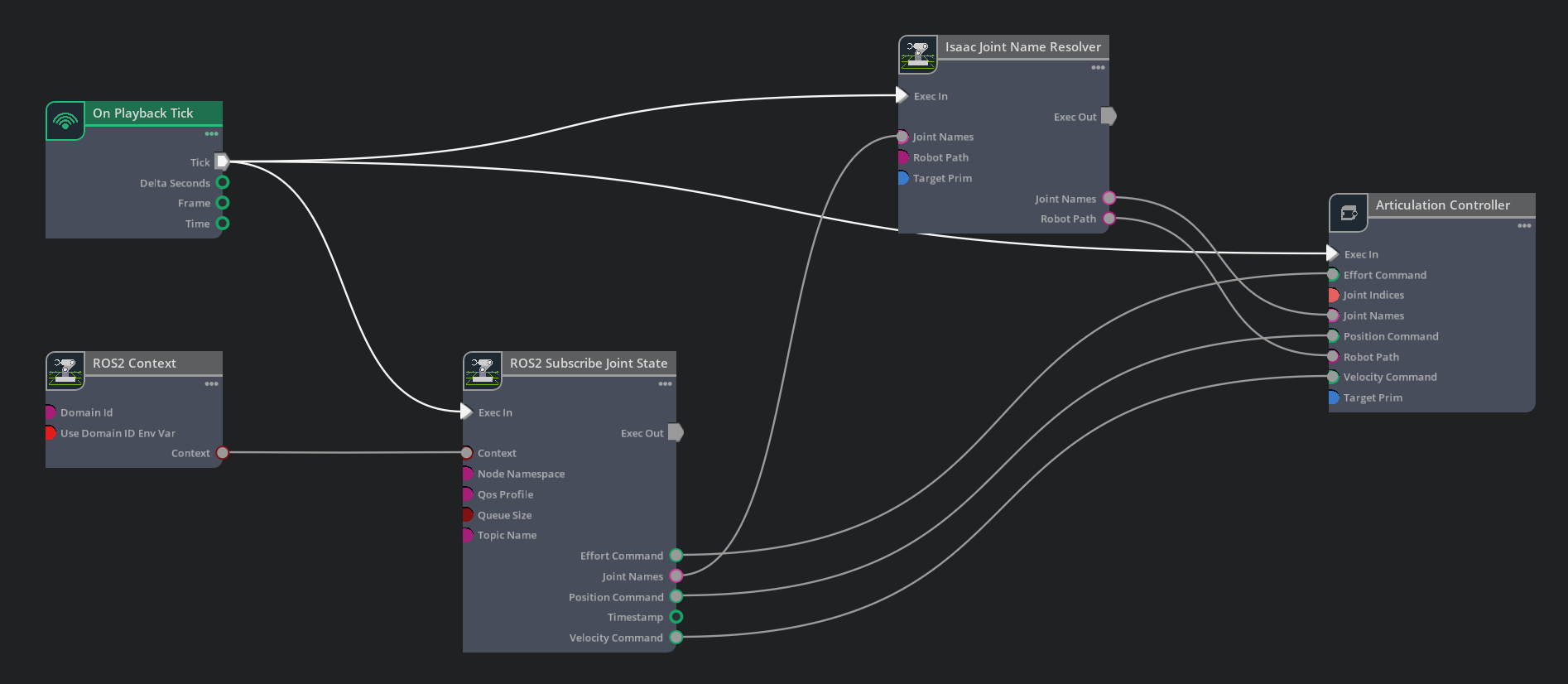 For the ROS 2 Joint State Subscriber pipeline, you can drag in the Isaac Joint Name Resolver OmniGraph node and connect it within the pipeline as shown below: