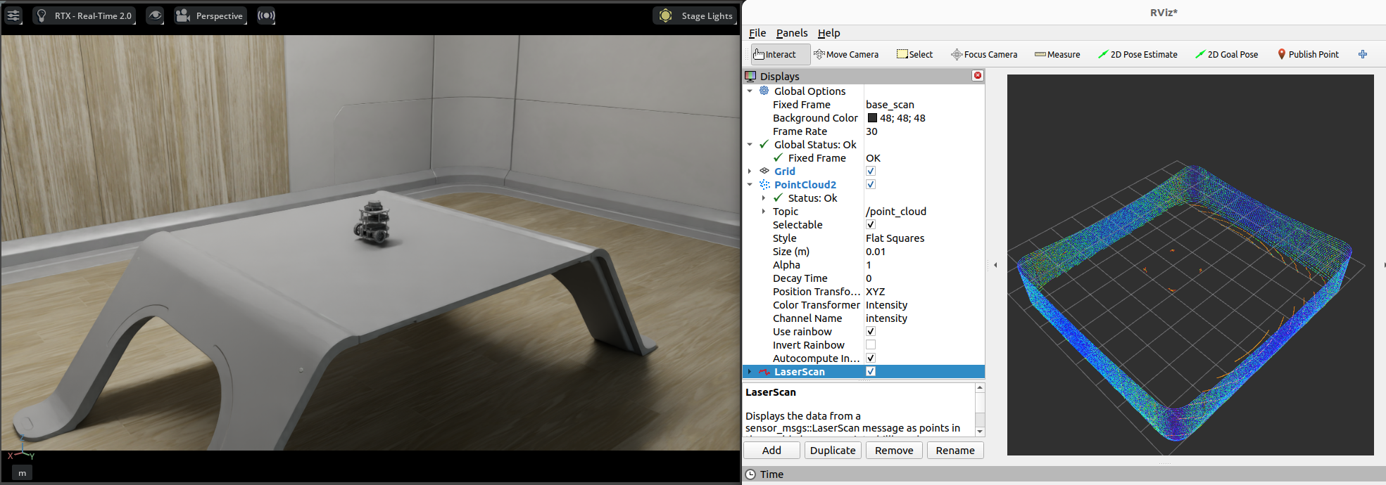 rviz2) in a sourced terminal.The lidar frame in Isaac Sim for the RTX Lidar is set to base_scan, update the fixed frame name in RViz accordingly.