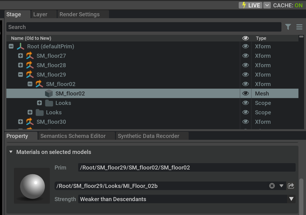 The /Root/SM_floor29/SM_floor02/SM_floor02 prim has a material prim assigned to it whose path is /Root/SM_floor29/Looks/MI_Floor_02b. If you want to add