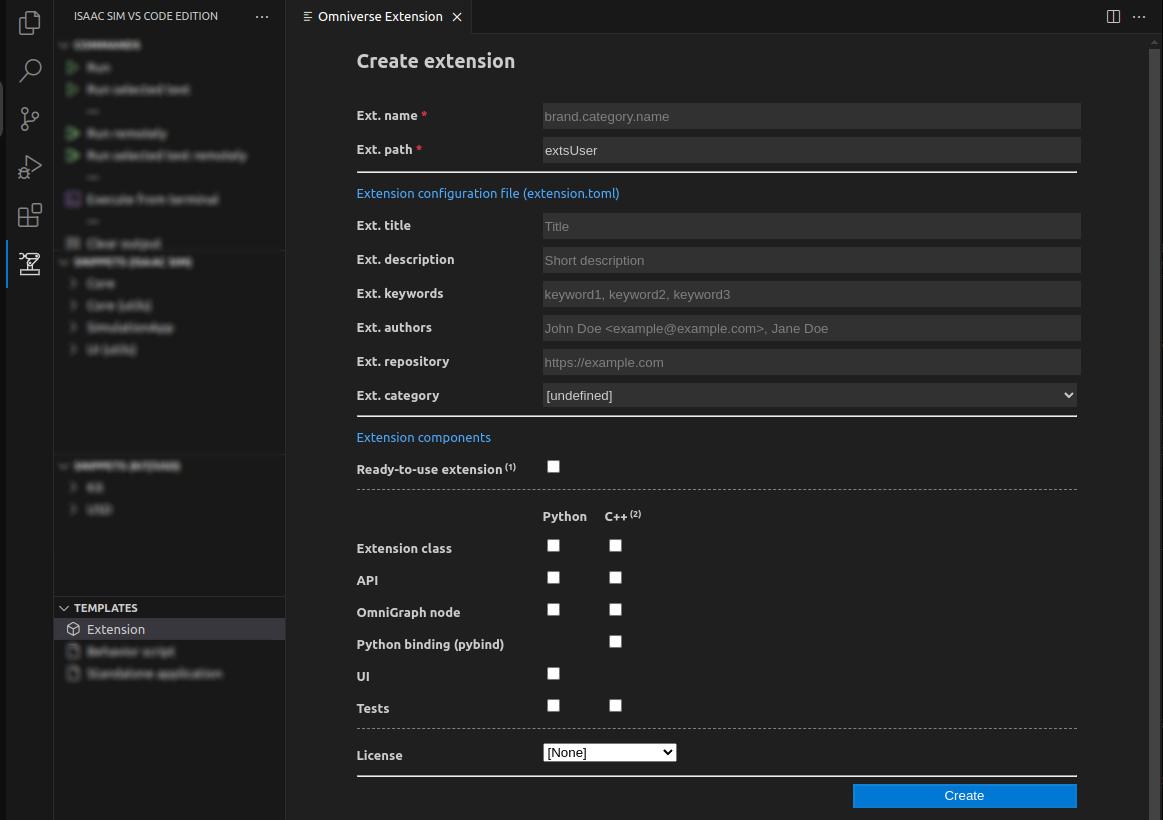 The Isaac Sim VS Code Edition is a Visual Studio Code extension that provides development support for NVIDIA Omniverse in general and Isaac Sim in particular. One of its features is the generation of advanced extension templates.