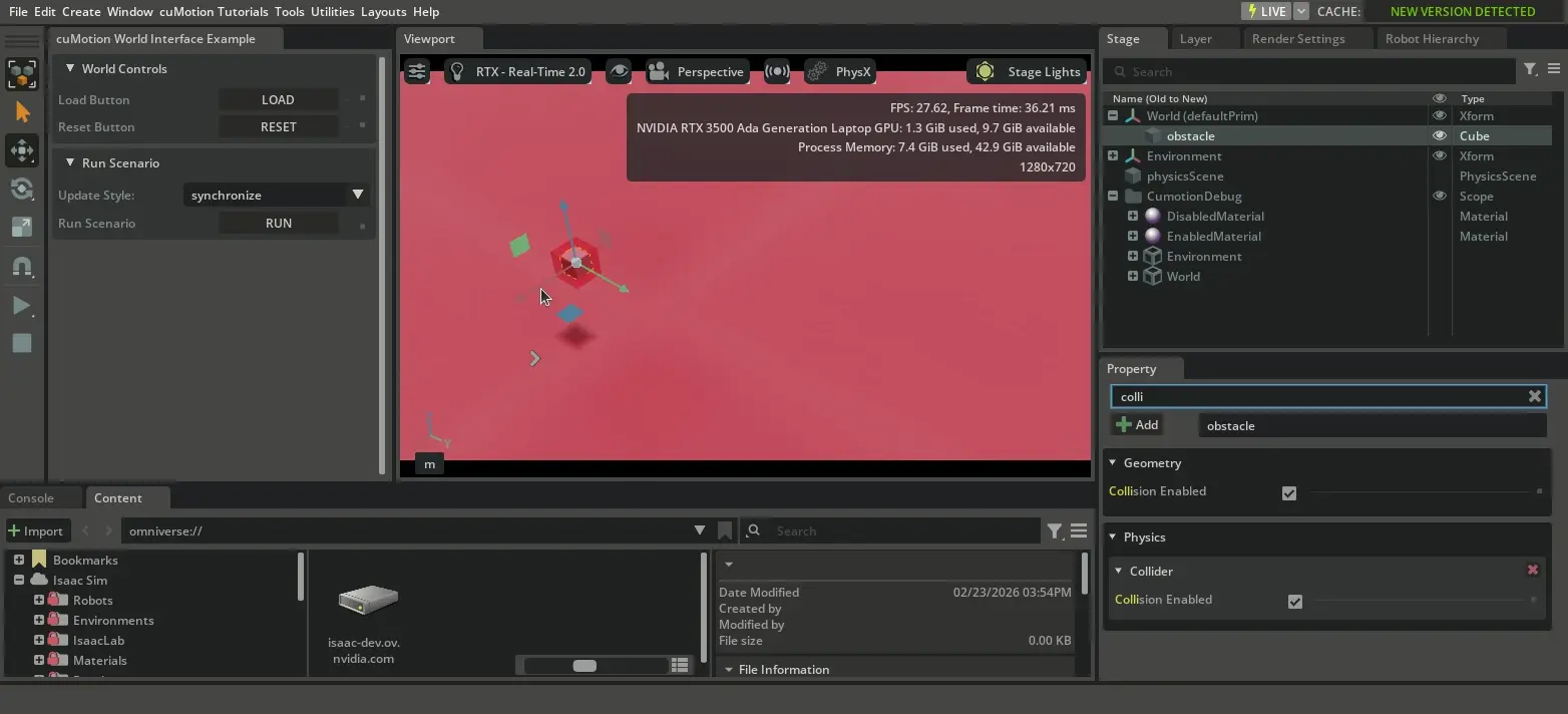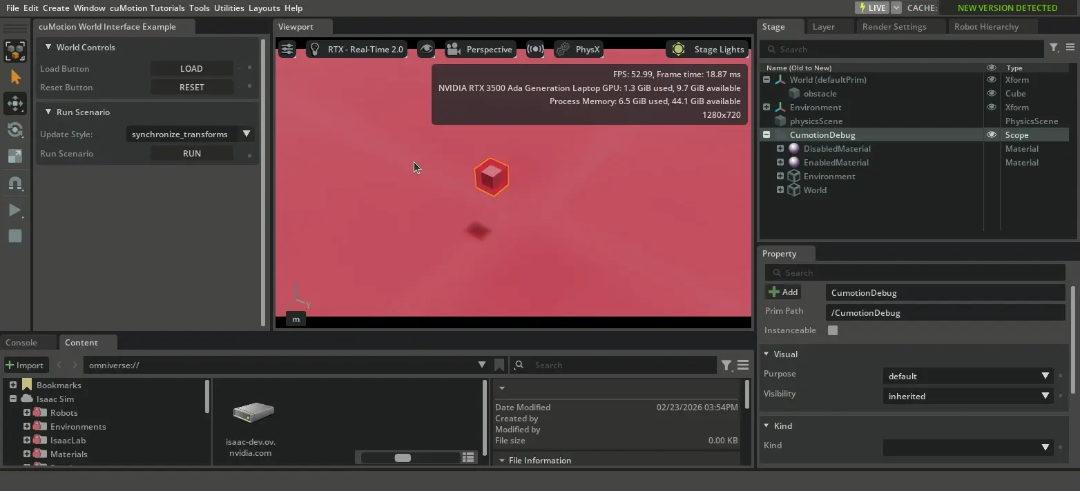 This tutorial provides an interactive environment for experimenting with the CumotionWorldInterface. Here are some ways to explore the tutorial