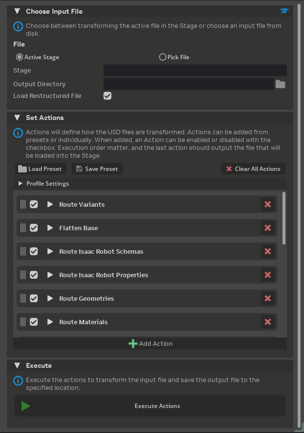 Isaac Sim includes a default profile called Isaac Sim Structure that transforms assets into the recommended Isaac Sim Asset Structure. This profile is automatically available in the recent presets menu.